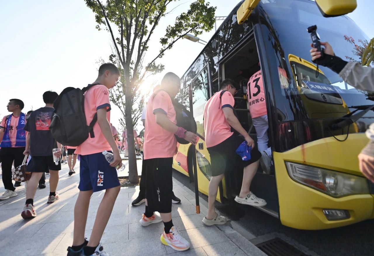 在這里,18輛由宿遷交通集團(tuán)統(tǒng)籌調(diào)度的定制公交早已整裝待發(fā),志愿者們手持車輛編號牌在車旁引導(dǎo)。